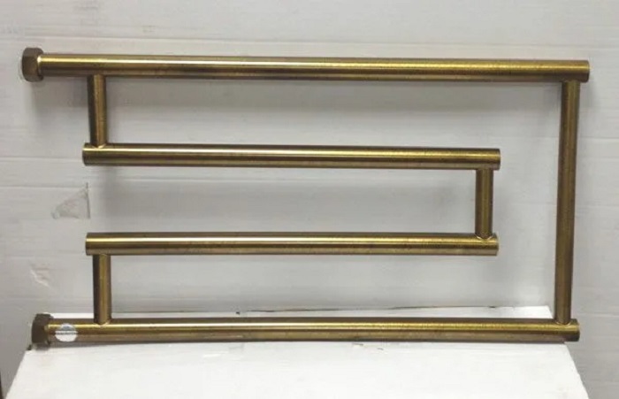 Порошкове фарбування з бронзовим ефектом — найдешевший варіант. Дає схожий зовнішній вигляд але найменш стійке до вологи і механічних впливів. Для ванної кімнати де рушникосушка постійно контактує з вологим повітрям і водою — ненадійний вибір.